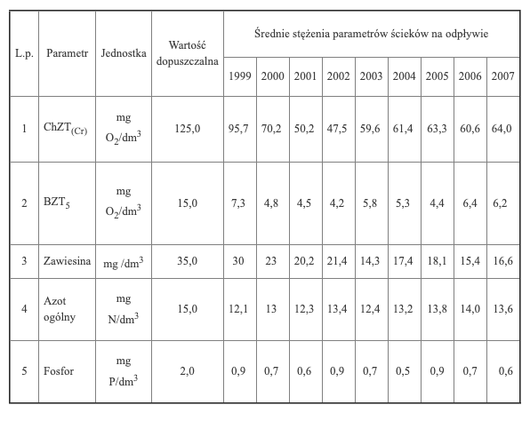 Tabela 1. Dopuszczalne wartości parametrów zawarte w pozwoleniu wodnoprawnym oraz średnie stężenia na odpływie